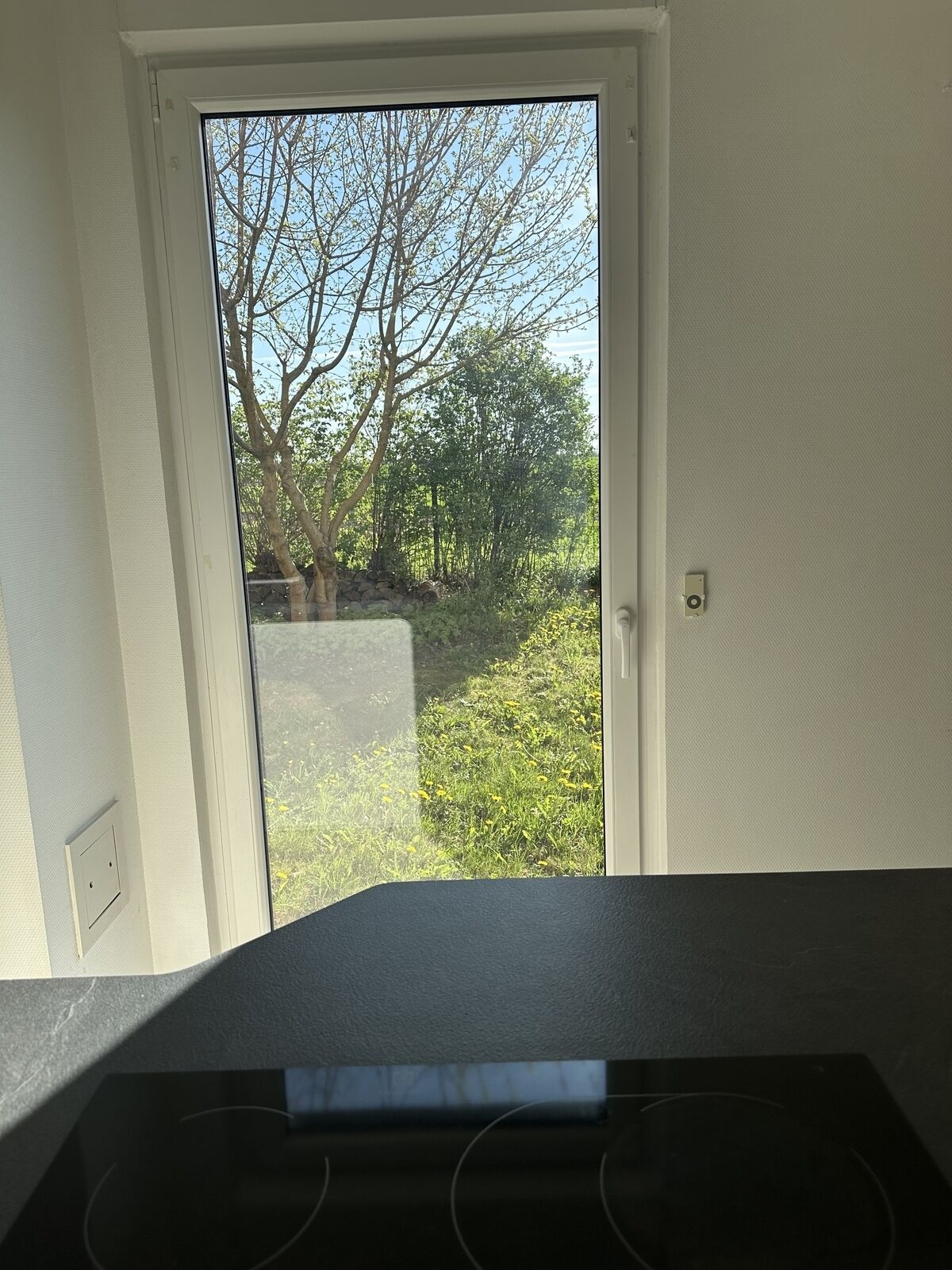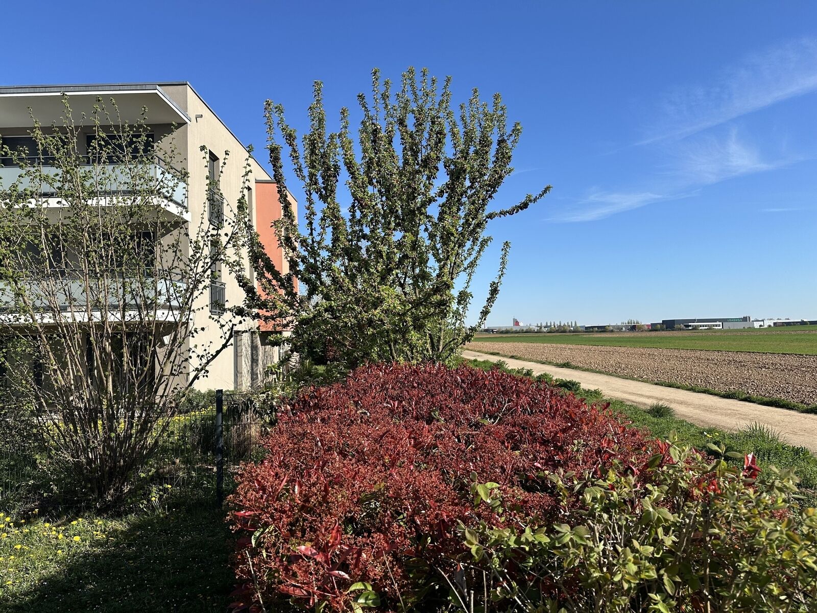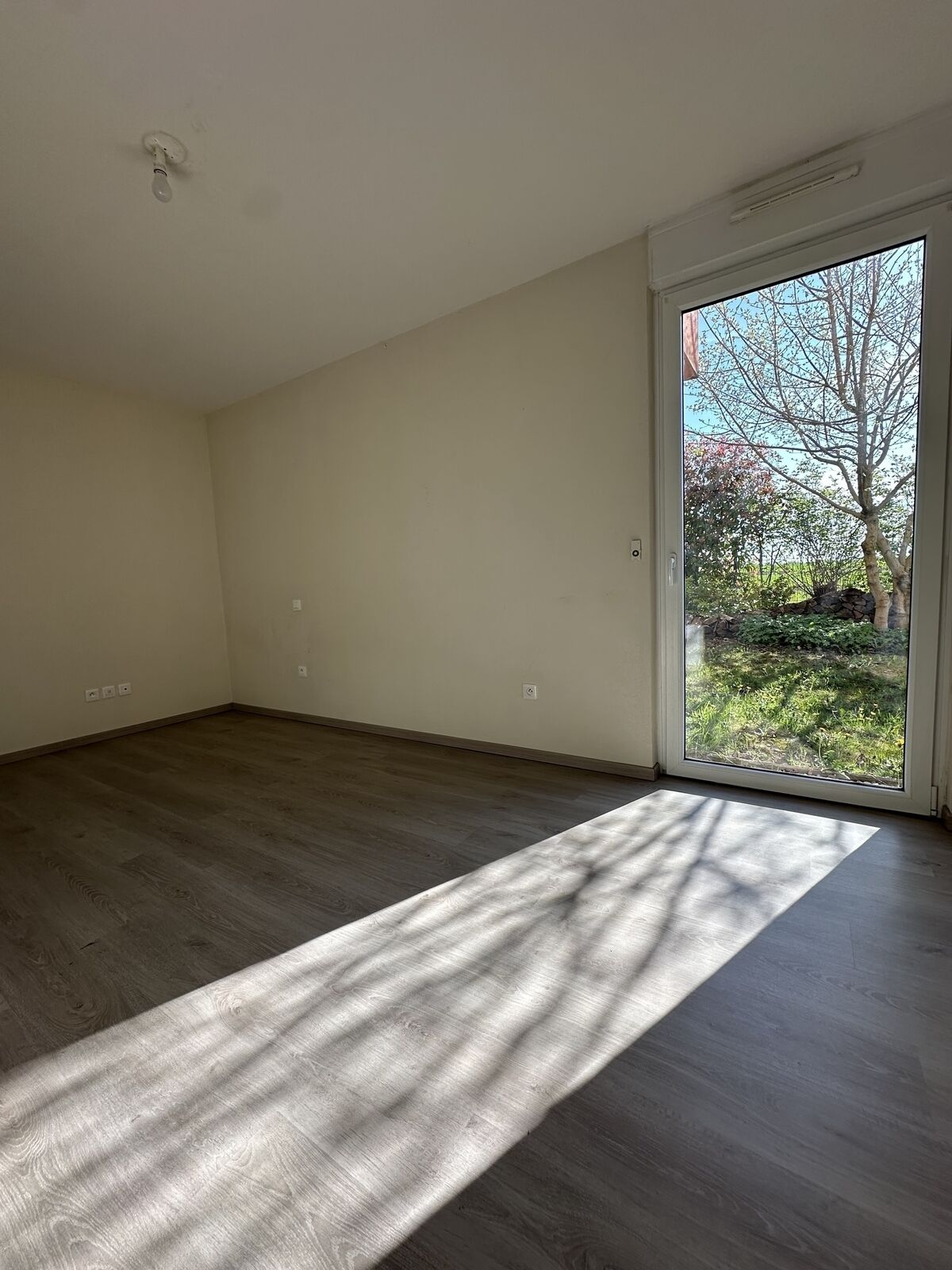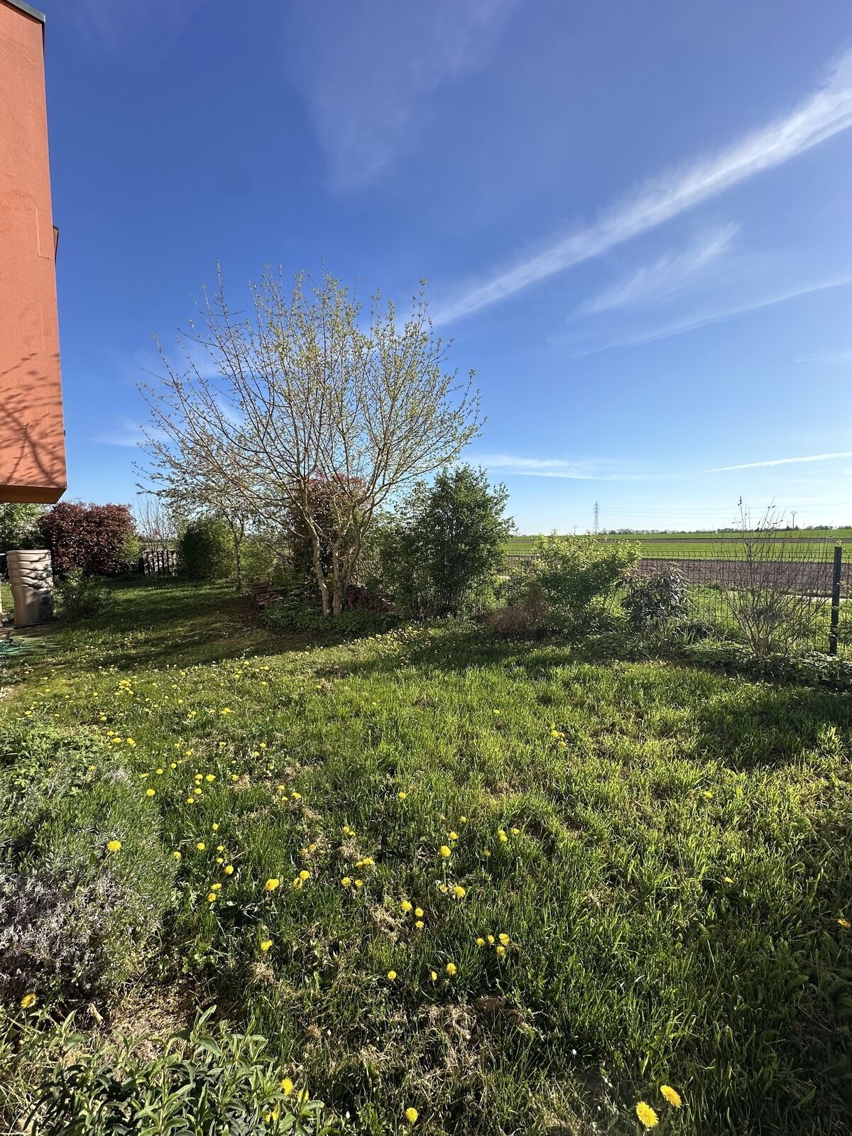 La terrasse couverte s’ouvre sur un jardin privatif en « L » de 275 m², entièrement clôturé, offrant une belle vue dégagée sur les champs.