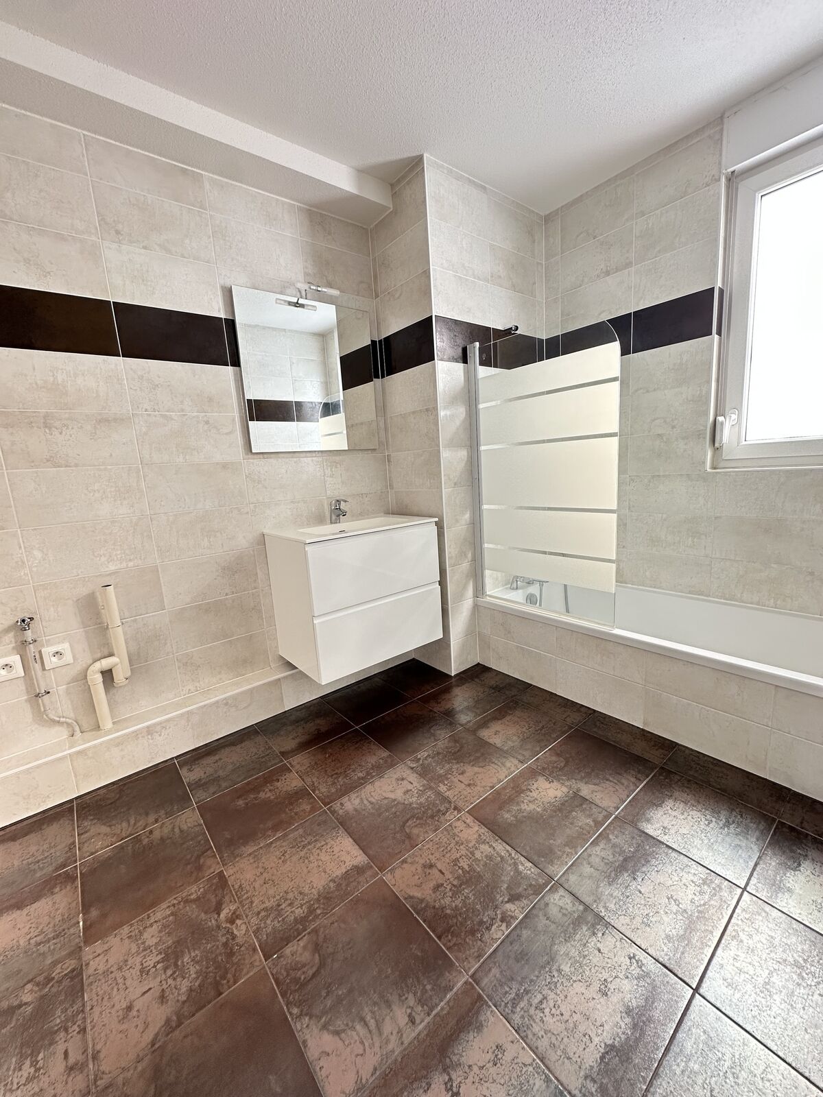 une salle de bains avec baignoire et paroi vitrée,